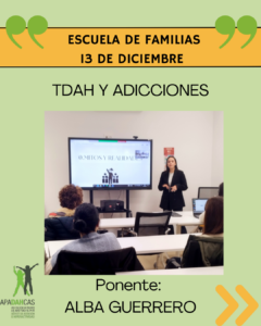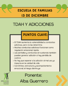 En esta ocasión, contamos con la ponencia de Alba Guerrero, quien abordó un tema de gran interés y actualidad: la relación entre el TDAH y las conductas adictivas, ofreciendo una mirada clara, realista y profundamente práctica.