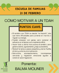 En esta ocasión contamos con la ponencia de Balma Moliner Castellano, psicóloga y neuropsicóloga clínica, quien nos ayudó a comprender cómo funciona la motivación en el TDAH y cómo podemos acompañar mejor desde casa.
