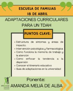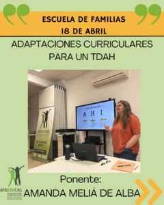 En esta ocasión contamos con la ponencia de Amanda Meliá de Alba, quien nos ayudó a comprender cómo gestionar las adaptaciones curriculares para los TDAH