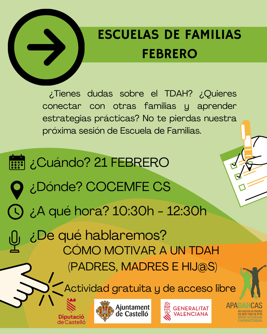 –Localización: Las Escuelas se realizarán en las instalaciones que nos cede COCEMFE Castellón. Para conocer dónde se encuentra, pincha aquí.