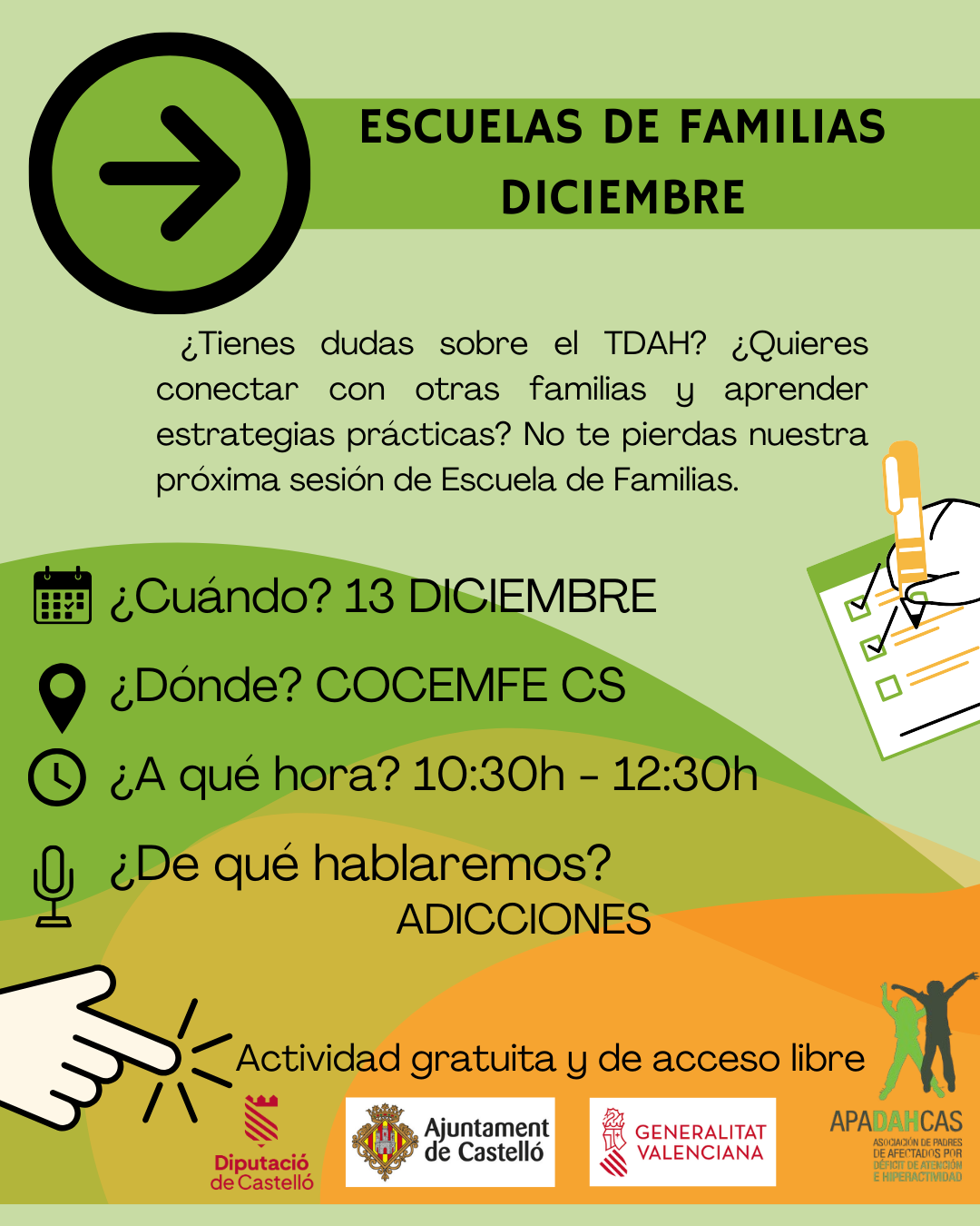 Estimados/as socios/as: Nos complace invitaros a participar en una nueva edición de nuestra Escuela de Familias, organizada por APADAHCAS. En esta ocasión, abordaremos el tema «ESTUDIO EN VALENCIA, INVESTIGACIÓN (TDAH EN NIÑAS)», una charla que…